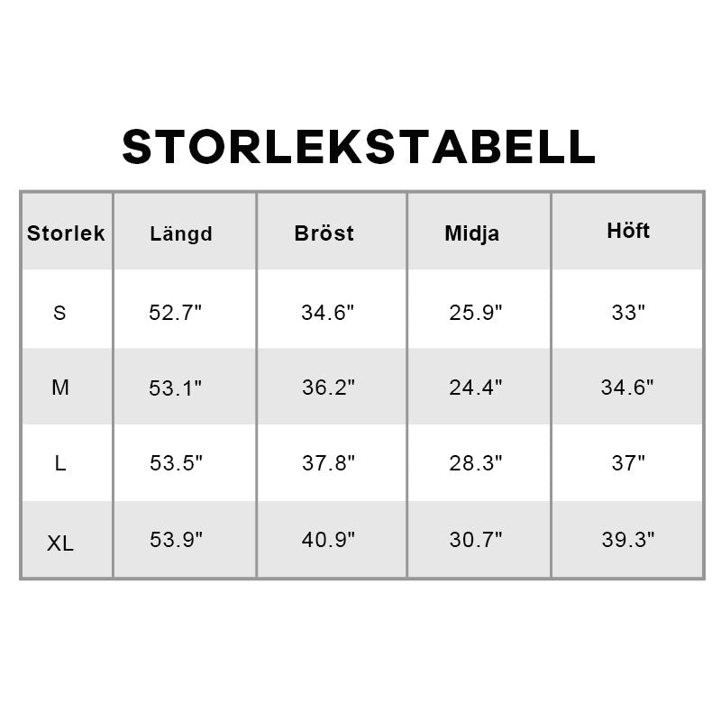đ Obs: KlĂ€nningen Ă€r lite stretchig, sĂ„ det Ă€r bĂ€st att vĂ€lja din vanliga storlek eller en storlek större om du Ă€r mellan tvĂ„ storlekar.