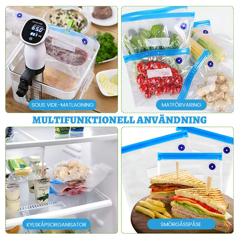 Använd den med flergångspåsar, vakuumpåsar eller återförslutningsbara påsar.