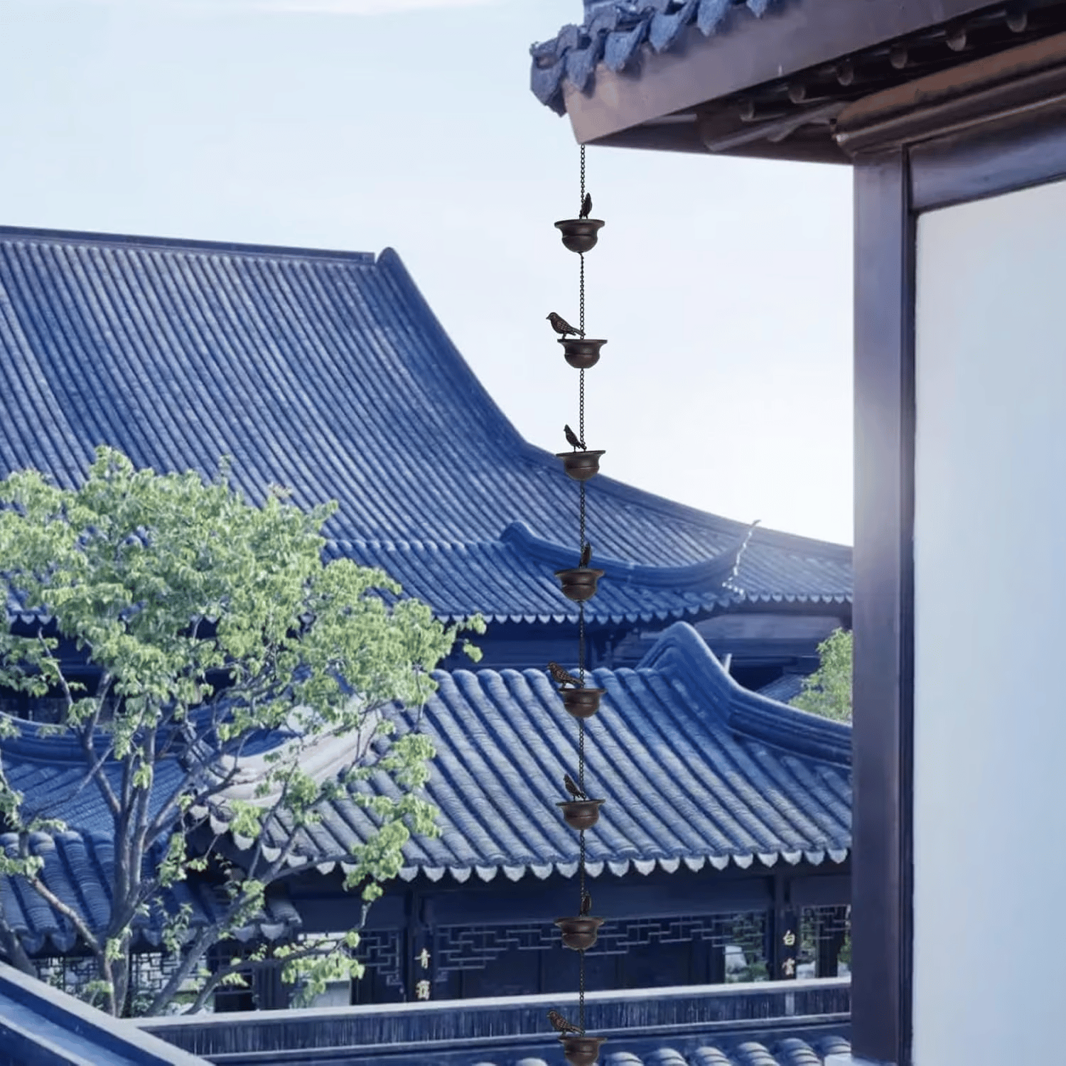 Denna kaskadformade regnkedja är ett fantastiskt alternativ till traditionella stuprör. Regnvattnet rinner graciöst från ett fågelbad till nästa och skapar en naturlig vattenfallseffekt som är både visuellt och auditivt lugnande.