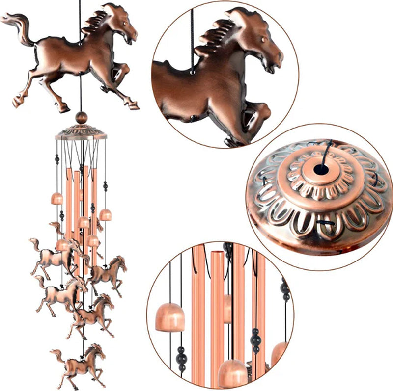 🐎【UNIK DESIGN】 Vindspel av kopparhäst, rent handgjort med en stark metallplatta, 4 hållbara aluminiumrör, 6 små lyckohästar, 1 stor lyckohäst. 6 järnkulor. Varje metallrör har sitt eget unika ljud när det kolliderar. Tillverkad av aluminium ger den ett vackert och harmoniskt ljud och ger ett klart och behagligt ljud överallt. När solen går upp reflekteras det vackra solskenet från vindspelet. När du hör vacker musik i vinden känner du dig väldigt avslappnad och bekväm.