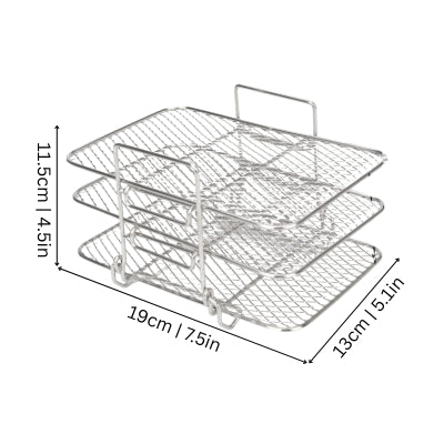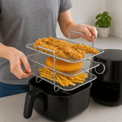 Vill du ta din luftfritteuse till nästa nivå? Denna runda rostfritt stålgrill med tre lager är din hemliga vapen för att laga mer, crisper och hälsosammare mat – perfekt för familjer och matälskare som älskar enkel, smakfull matlagning.