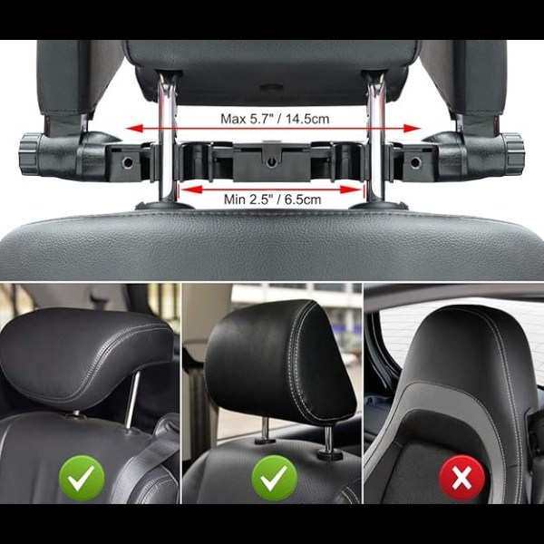 Oavsett om du är lång eller kort, erbjuder den fullständig justerbarhet. Nackstöden roterar 180° och de justerbara hålpositionerna (7-16 cm) gör att du kan hitta den mest bekväma och individuella positionen för vuxna och barn. Tack vare det justerbara avståndet mellan stängerna passar den perfekt i alla bilmodeller eller fordon.