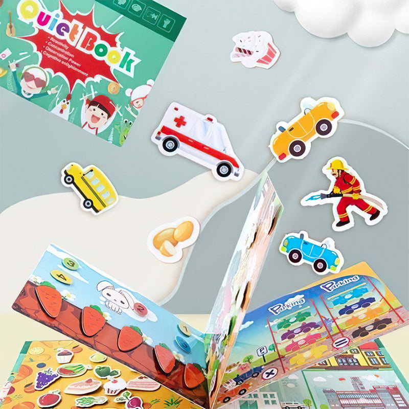 - Stil: trafik/djur/siffra/grönsaker och frukter/fyra-i-ett tyst bok