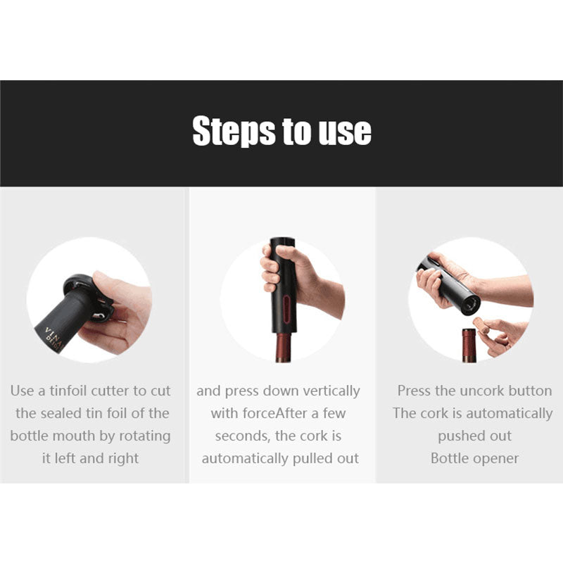 - Tryck på avkorkningsknappen Korken skjuts automatiskt ut Flasköppnare