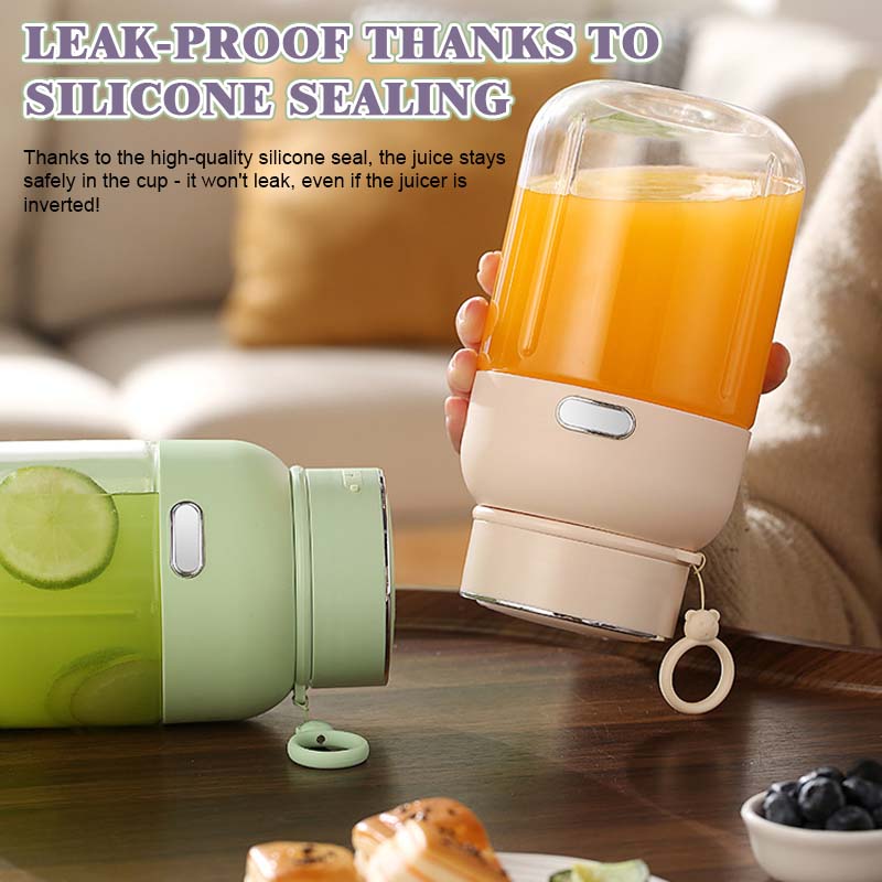 Tack vare den högkvalitativa silikontÀtningen stannar din juice sÀkert i koppen - inget lÀckage, Àven om juicemaskinen vÀnds upp och ner! Perfekt för resor eller pÄ gymmet.