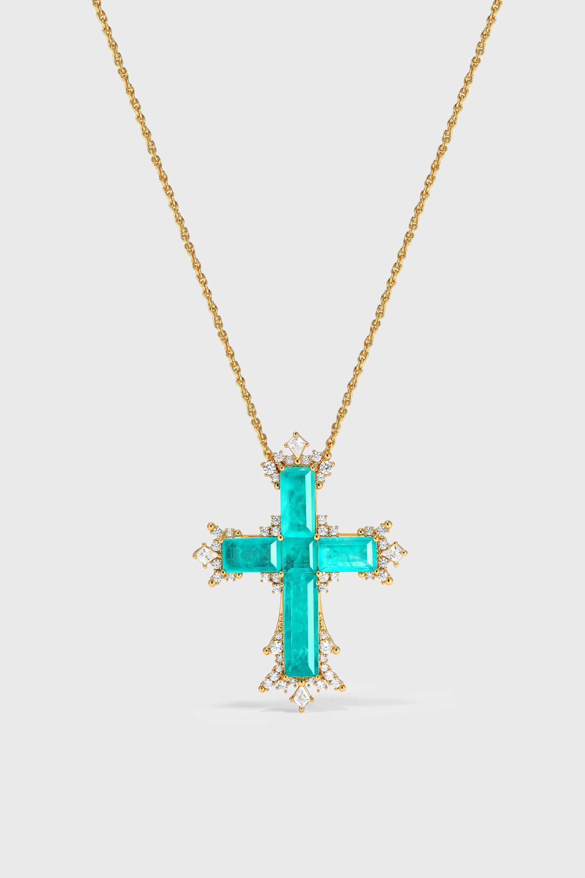 Inspirerad av Medelhavssommaren fÄngar korssilhuetten lagren av havsblÄtt i en tidlös form. Den Paraiba-fÀrgade isspruckna zirkonen glimmar med kristallklarhet och ekar vÄgornas mjuka rörelser och det skimrande tidvattnet nedanför.