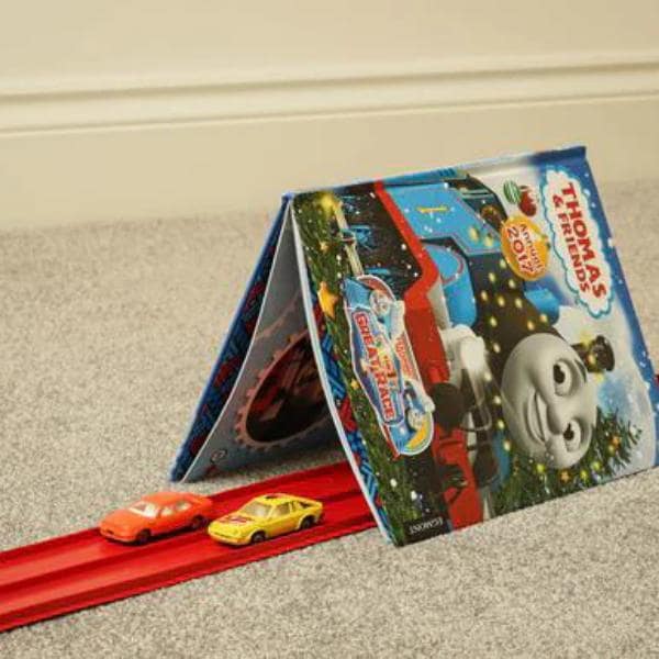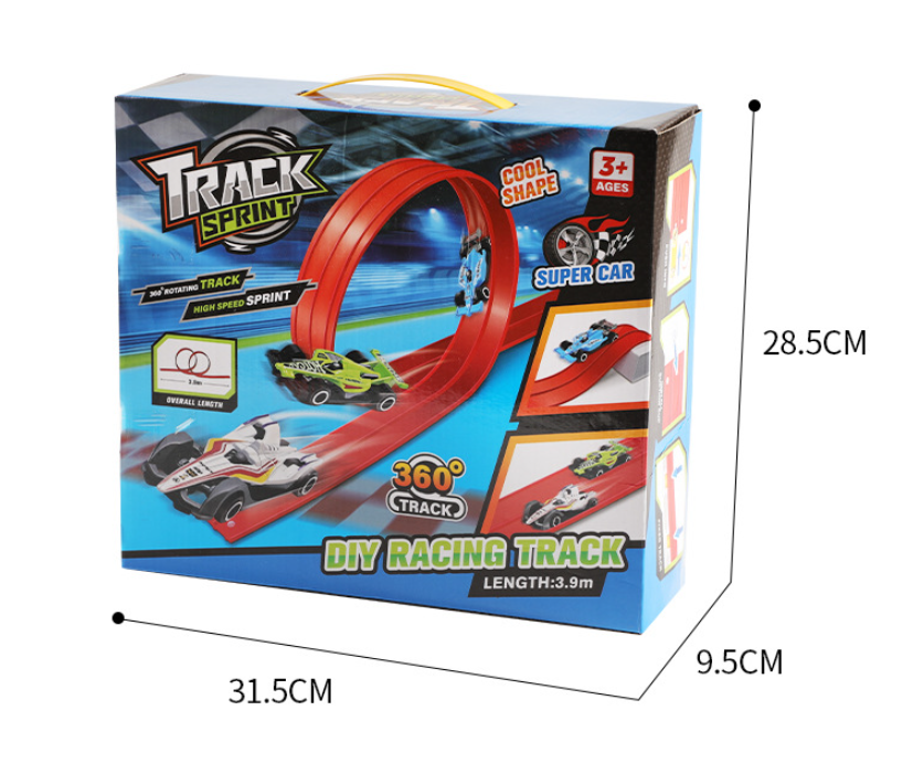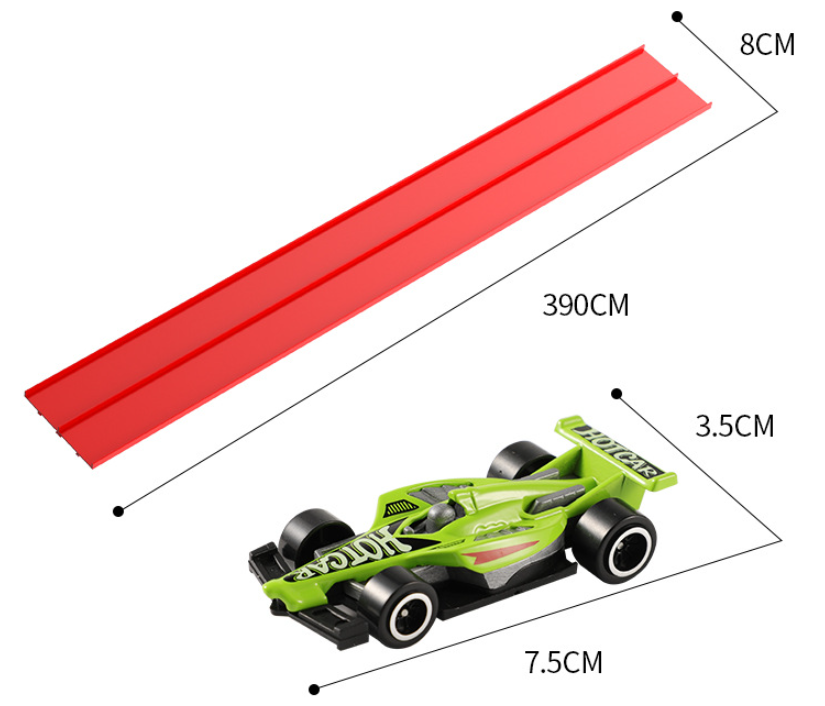 Använd dina befintliga leksaksbilar, fäst den bara på ett fönster eller en dörr, rulla ut den och börja tävla – drivs enbart av gravitationen, inga batterier eller dyra tillbehör.