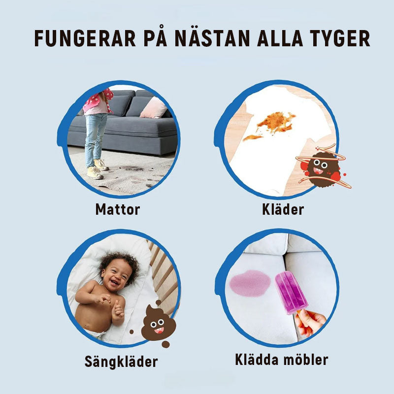 Även med olja, blod, choklad, blöjspill eller gräsfläckar: spraya bara på, låt stå en kort stund och fläcken försvinner - även om du upptäcker den först 2-3 dagar senare. Inget gnuggande, ingen blekning, inga kemikalier.