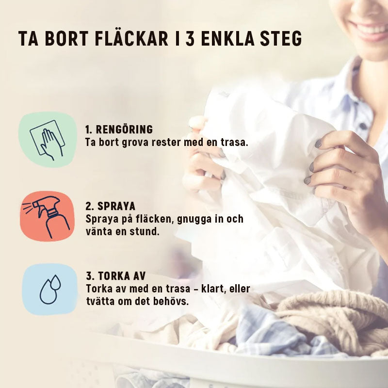 Oavsett om du sitter i bilen, på ett café eller är ute och går med barnen - om en fläck uppstår behöver du ingen tvättmaskin. Spraya bara på, vänta ett ögonblick, torka av - och fläcken är borta. Rent, snabbt och utan stress.